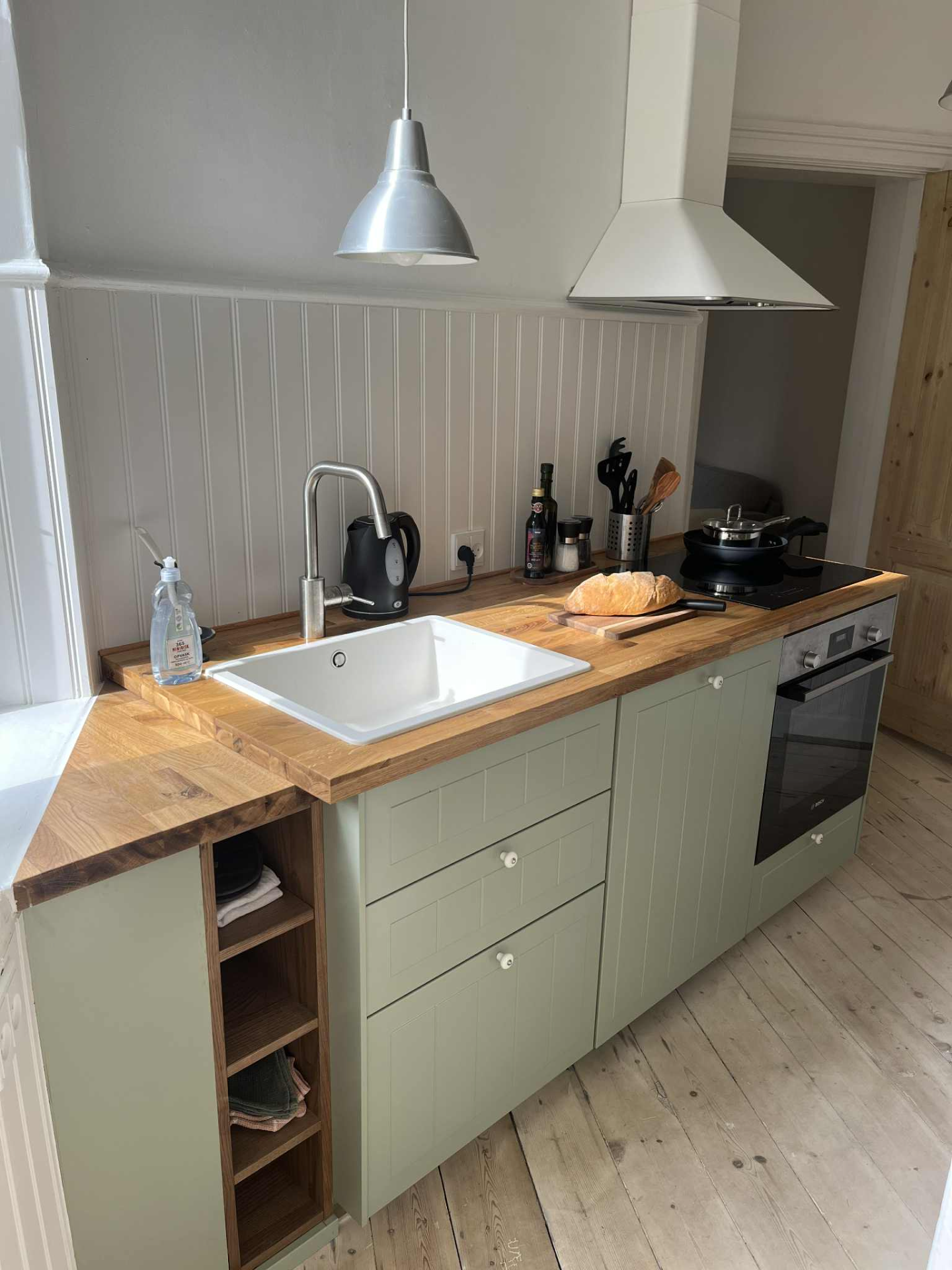 I køkkenet finder du alt, hvad du har brug for: Køleskab, fryser, kogeplader, ovn, opvaskemaskine, kaffemaskine, brødrister, el-kedel, gryder, bestik og service.